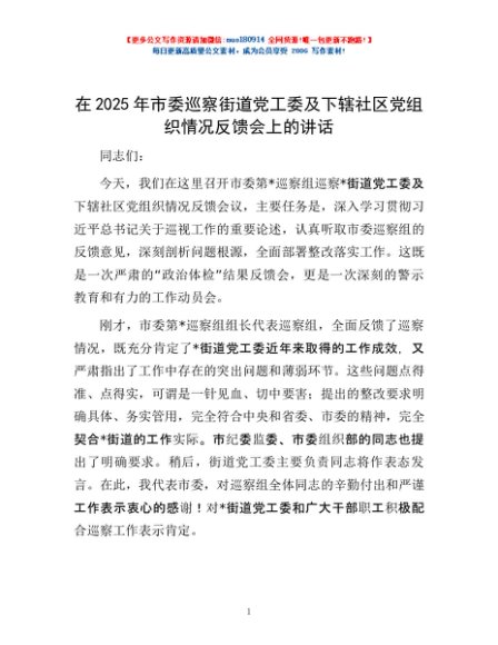 / 在2025年市委巡察街道党工委及下辖社区党组织情况反馈会上的讲话