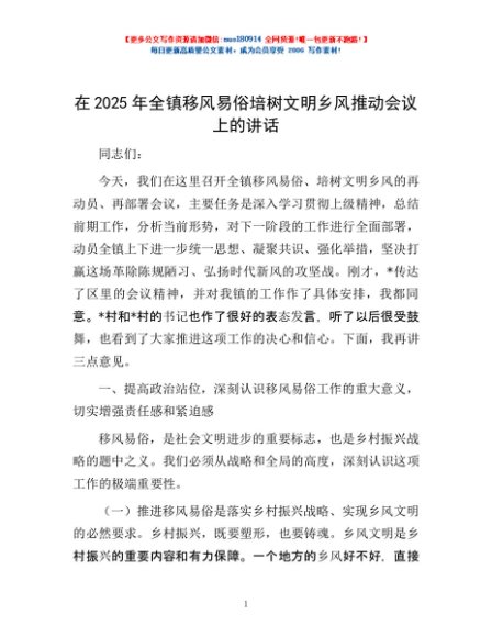 / 在2025年全镇移风易俗培树文明乡风推动会议上的讲话