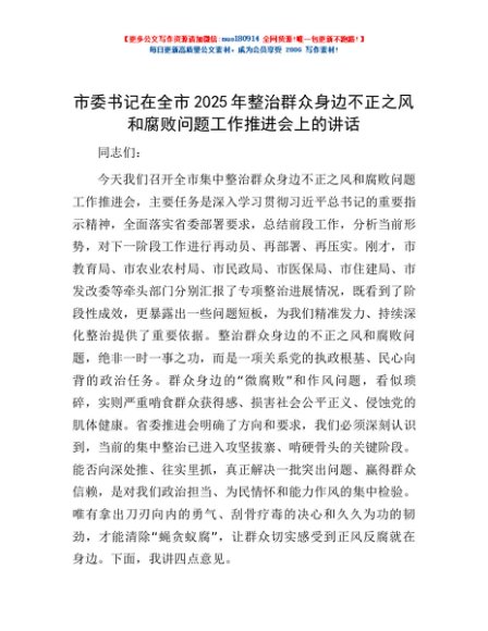 / 市委书记在全市2025年整治群众身边不正之风和腐败问题工作推进会上的讲话