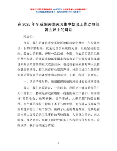 / 在2025年全系统医德医风集中整治工作动员部署会议上的讲话