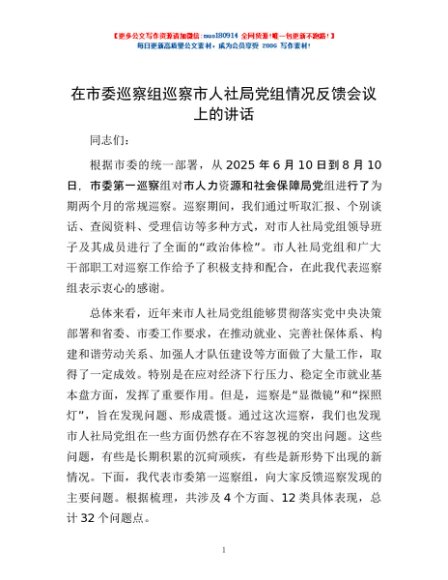 / 在市委巡察组巡察市人社局党组情况反馈会议上的讲话