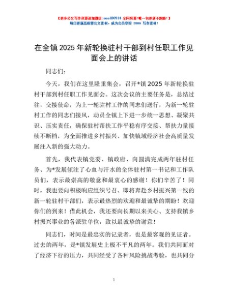 / 在全镇2025年新轮换驻村干部到村任职工作见面会上的讲话