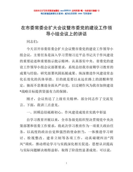 / 在市委常委会扩大会议暨市委党的建设工作领导小组会议上的讲话
