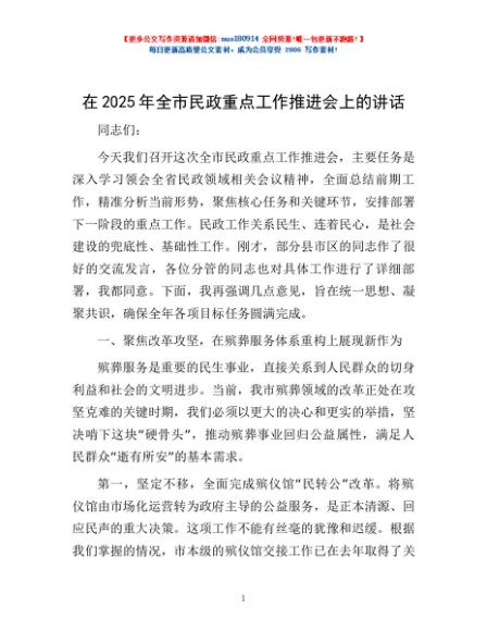 / 在2025年全市民政重点工作推进会上的讲话