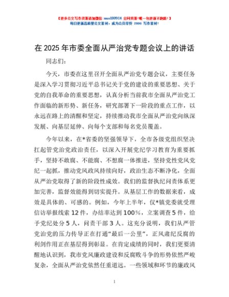 / 在2025年市委全面从严治党专题会议上的讲话