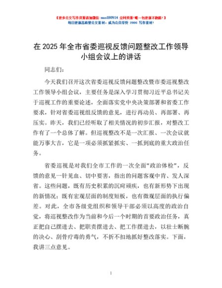 / 在2025年全市省委巡视反馈问题整改工作领导小组会议上的讲话