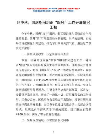 / 区中秋、国庆期间纠正“四风”工作开展情况汇报