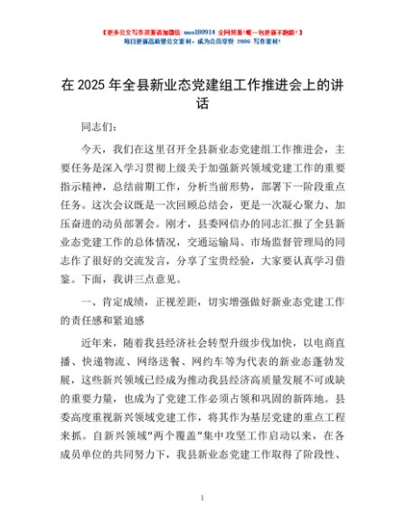 / 在2025年全县新业态党建组工作推进会上的讲话
