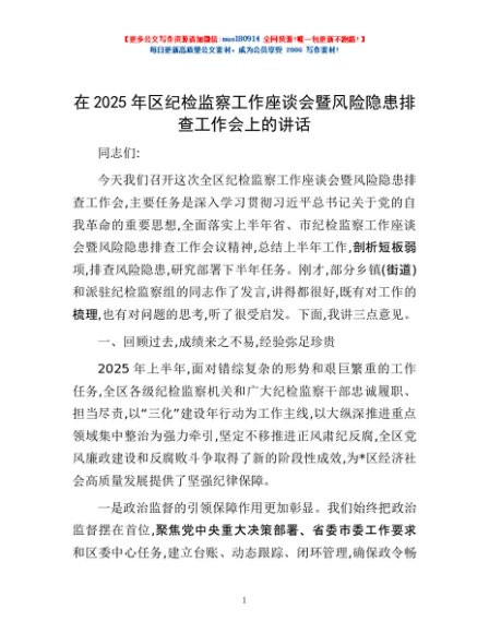 / 在2025年区纪检监察工作座谈会暨风险隐患排查工作会上的讲话