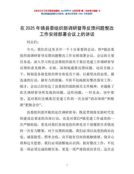 / 在2025年镇县委组织部调研督导反馈问题整改工作安排部署会议上的讲话