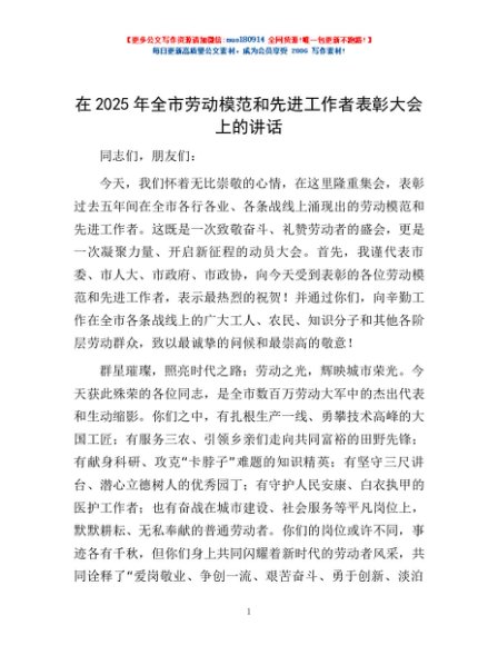 / 在2025年全市劳动模范和先进工作者表彰大会上的讲话