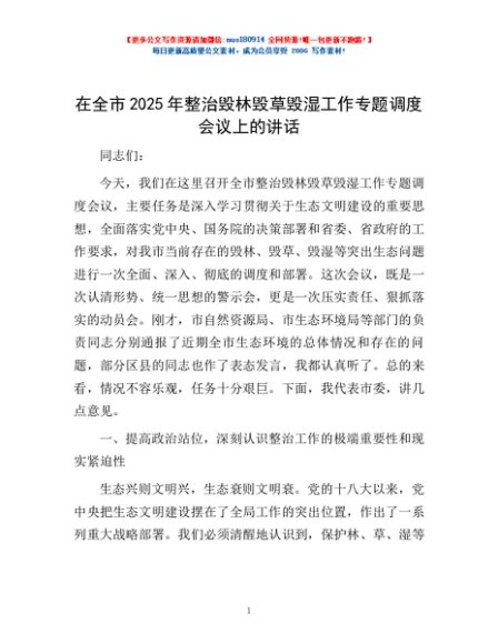 / 在全市2025年整治毁林毁草毁湿工作专题调度会议上的讲话