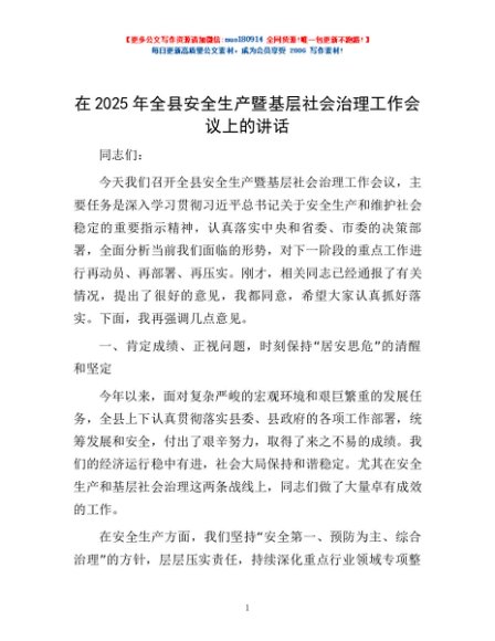 / 在2025年全县安全生产暨基层社会治理工作会议上的讲话