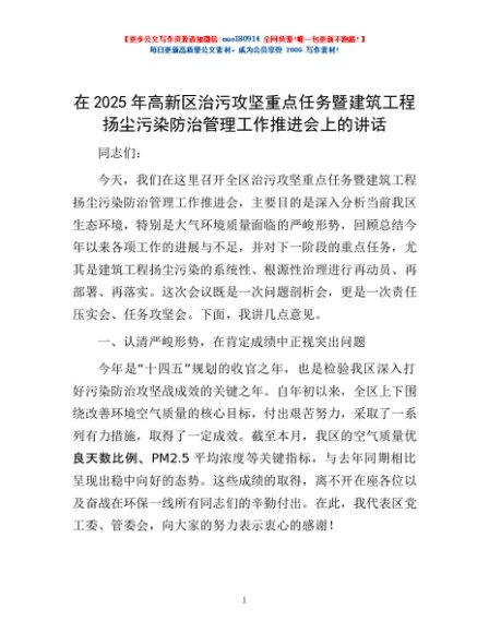 / 在2025年高新区治污攻坚重点任务暨建筑工程扬尘污染防治管理工作推进会上的讲话
