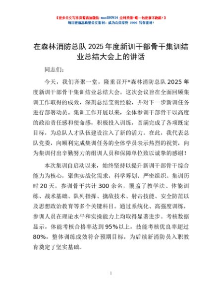 / 在森林消防总队2025年度新训干部骨干集训结业总结大会上的讲话