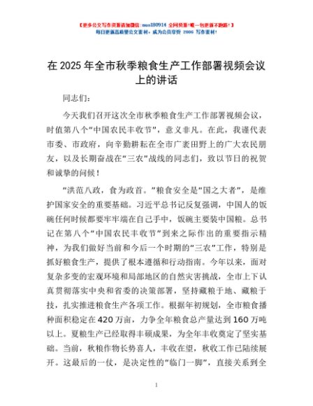 / 在2025年全市秋季粮食生产工作部署视频会议上的讲话