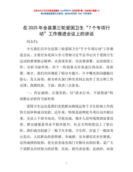 / 在2025年全县第三轮爱国卫生“7个专项行动”工作推进会议上的讲话