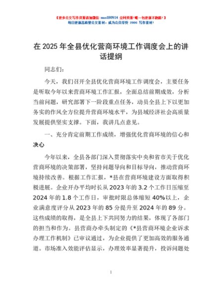 / 在2025年全县优化营商环境工作调度会上的讲话提纲