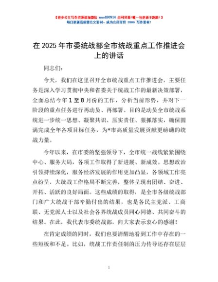 / 在2025年市委统战部全市统战重点工作推进会上的讲话