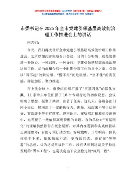 / 市委书记在2025年全市党建引领基层高效能治理工作推进会上的讲话