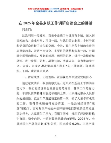 / 在2025年全县乡镇工作调研座谈会上的讲话