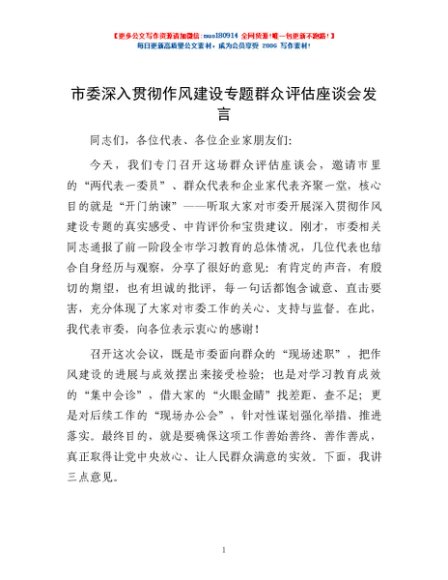 / 市委深入贯彻作风建设专题群众评估座谈会发言