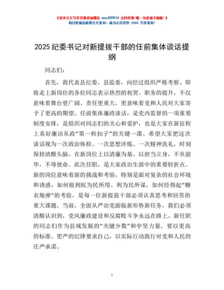 / 2025纪委书记对新提拔干部的任前集体谈话提纲