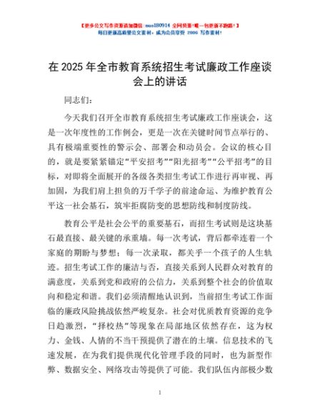 / 在2025年全市教育系统招生考试廉政工作座谈会上的讲话
