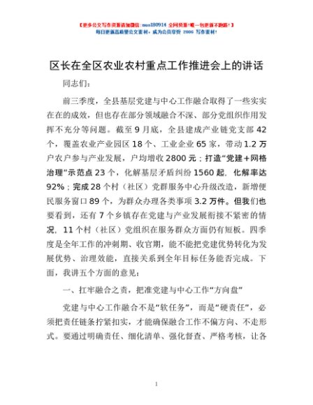 / 区长在全区农业农村重点工作推进会上的讲话