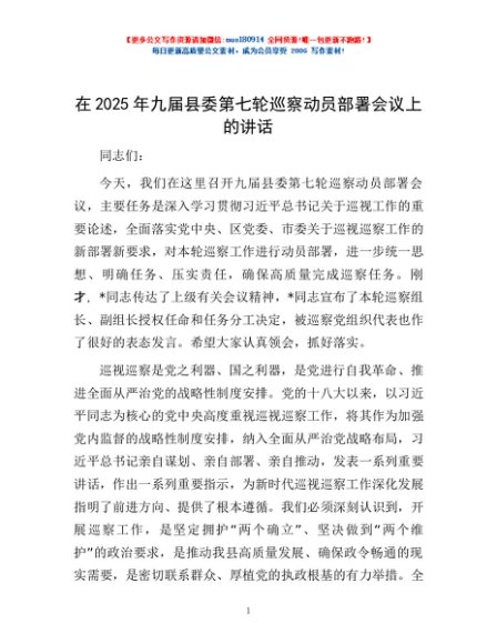 / 在2025年九届县委第七轮巡察动员部署会议上的讲话