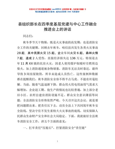 / 县组织部长在四季度基层党建与中心工作融合推进会上的讲话