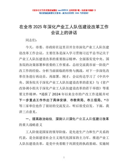 / 在全市2025年深化产业工人队伍建设改革工作会议上的讲话