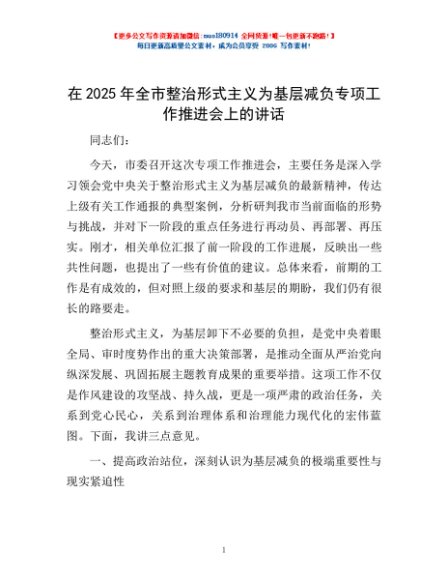 / 在2025年全市整治形式主义为基层减负专项工作推进会上的讲话