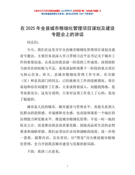 / 在2025年全县城市精细化管理项目谋划及建设专题会上的讲话