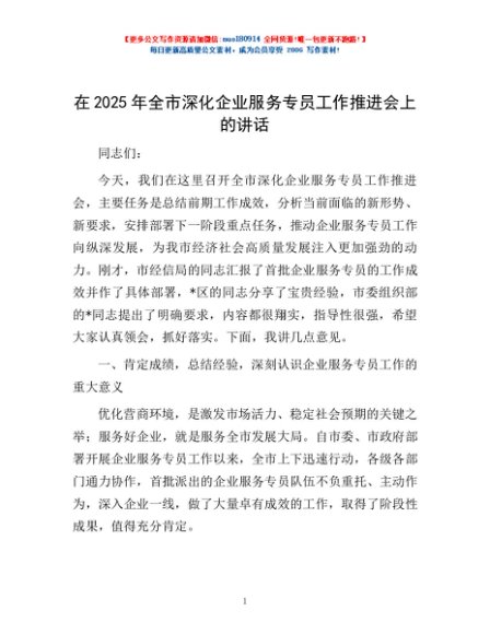 / 在2025年全市深化企业服务专员工作推进会上的讲话