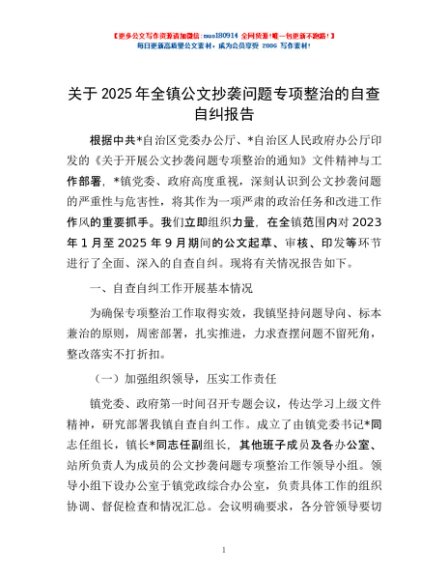 / 关于2025年全镇公文抄袭问题专项整治的自查自纠报告