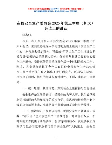 / 在县安全生产委员会2025年第三季度(扩大)会议上的讲话