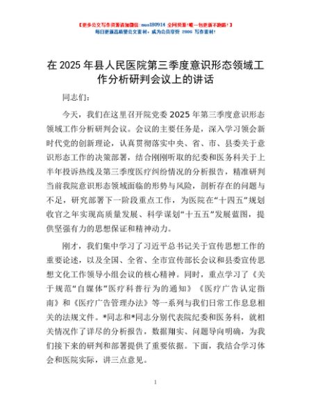/ 在2025年县人民医院第三季度意识形态领域工作分析研判会议上的讲话