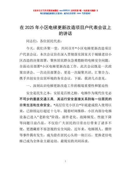 / 在2025年小区电梯更新改造项目户代表会议上的讲话