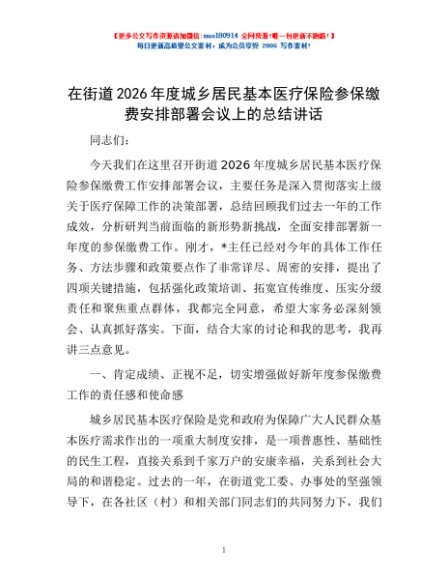 / 在街道2026年度城乡居民基本医疗保险参保缴费安排部署会议上的总结讲话