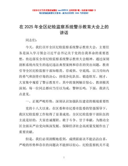 / 在2025年全区纪检监察系统警示教育大会上的讲话