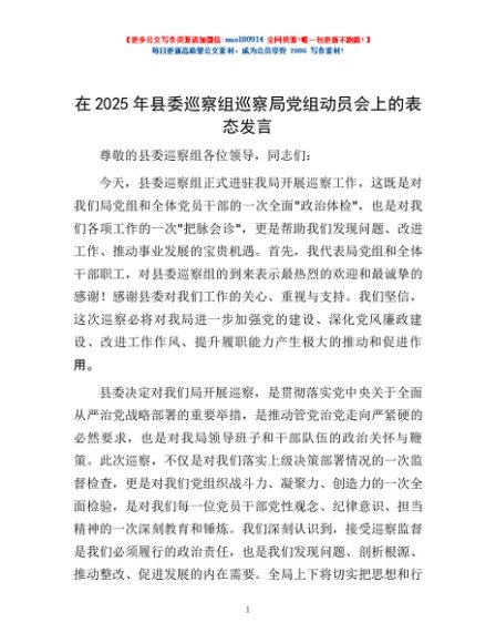 / 在2025年县委巡察组巡察局党组动员会上的表态发言