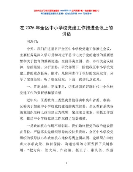 / 在2025年全区中小学校党建工作推进会议上的讲话