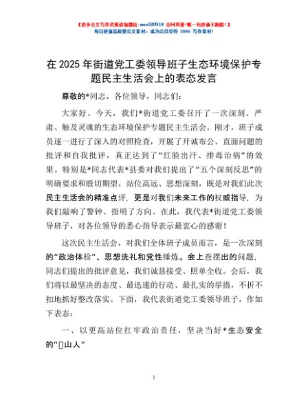/ 在2025年街道党工委领导班子生态环境保护专题民主生活会上的表态发言