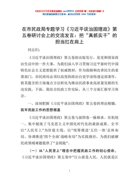 / 在市民政局专题学习《习近平谈治国理政》第五卷研讨会上的交流发言:把“真抓实干”的担当扛在肩上