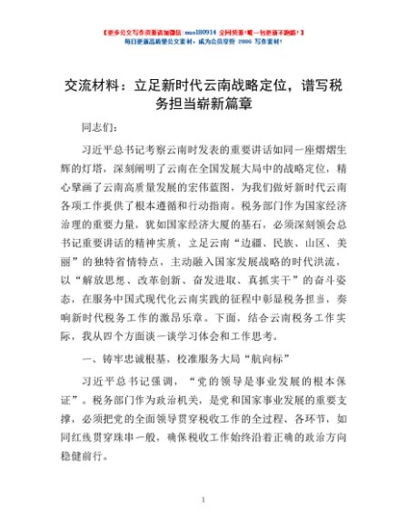 / 交流材料:立足新时代云南战略定位,谱写税务担当崭新篇章