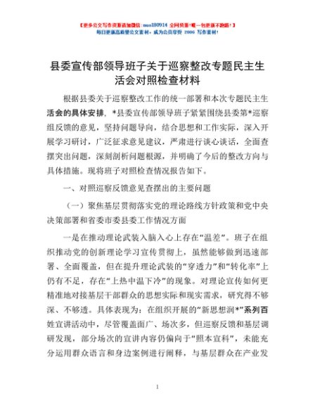 县委宣传部领导班子关于巡察整改专题民主生活会对照检查材料