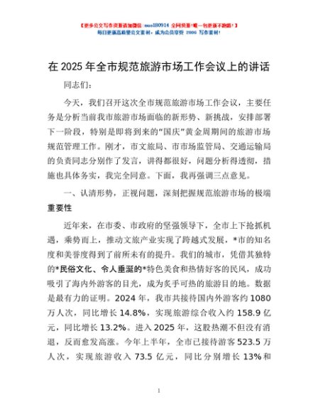 / 在2025年全市规范旅游市场工作会议上的讲话