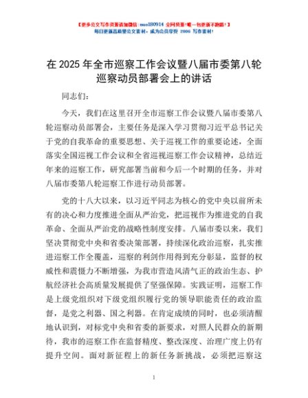 / 在2025年全市巡察工作会议暨八届市委第八轮巡察动员部署会上的讲话