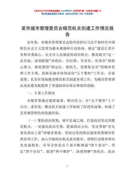 / 某市城市管理委员会模范机关创建工作情况报告